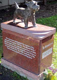 This cemetary is loaded with stars (former stars?), and Toto's monument was placed right outside the imposing Cathedral Mausoleum, only a stone's throw from Hattie McDaniel's placard/monument (you remember Mammy in Gone With the Wind, right?), dashing Tyrone Power, and lots of duck and goose crap, thanks to a rather "fowl" nearby pond. I kid you not: If you go there, bring an old pair of shoes or boots and a scraper because there isn't a clean spot anywhere on the lawns around these gravesites. And by the way: Hattie McDaniel isn't really buried there: She wanted to be there, but there was a "whites only" policy back then; McDaniel's survivors declined the offer to have her remains relocated to HFC...can't say that I blame them.