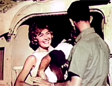 Yes, after the filming was completed, the winds kicked in, and it was not possible to airlift Shirley back down to earth. Contrary to many reports, no, she and her mechanic did not spend the night on top of Castleton Tower. After a couple of hours, the winds died down, and both humans were airlifted to safety.(UPDATE) On the left is the briefer alternate 1964 version of the same ad, rarely found anywhere. Other than lightening the clip, reducing some of the greenish hues, and getting rid of the time-stamp, I haven't tinkered with the audio or anything else: This is how I found it.